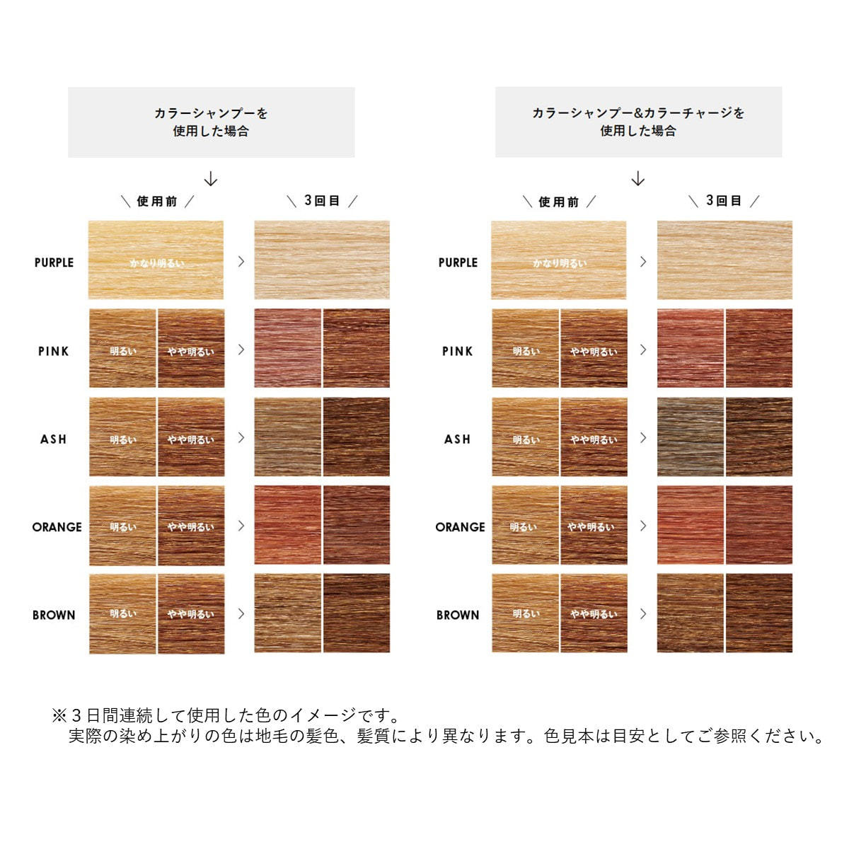 4つのカラーから選べるカラーシャンプーと&カラーチャージ(トリートメント)のダブル使いで、サロンカラーにさらに色をチャージ。